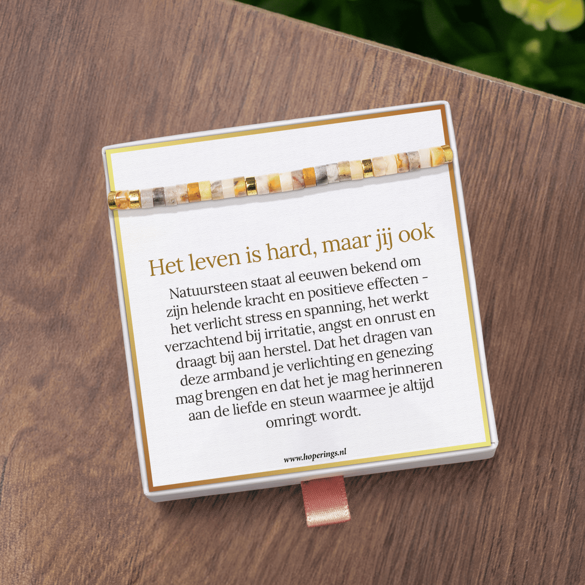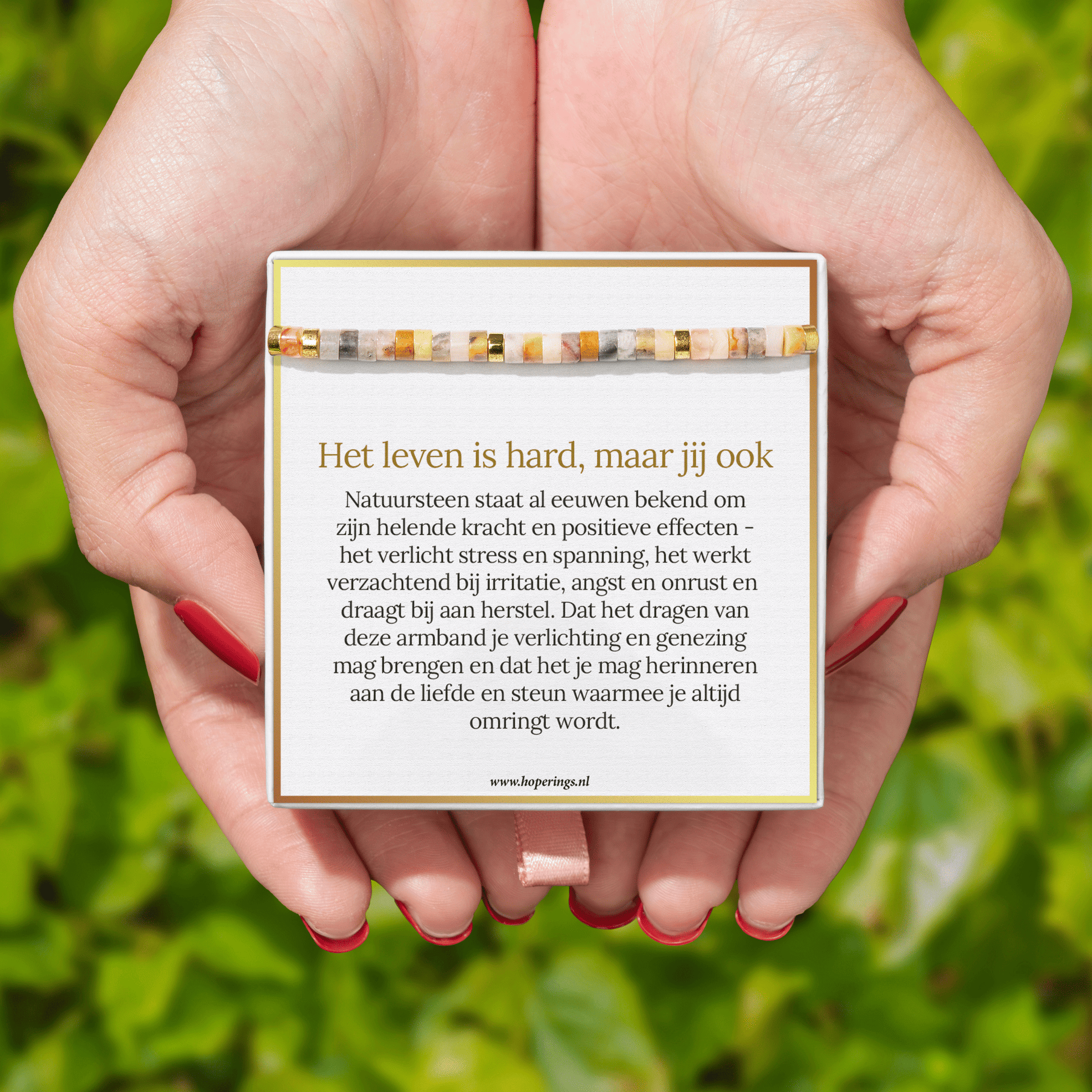 "Ik vind deze armband echt fantastisch! Hij is niet alleen heel mooi, de boodschap erachter is zo inspirerend. Ik draag hem elke dag, als een herinnering om altijd sterk te blijven."