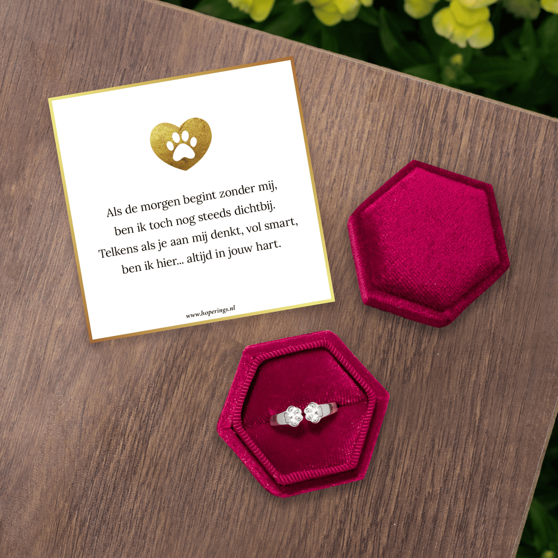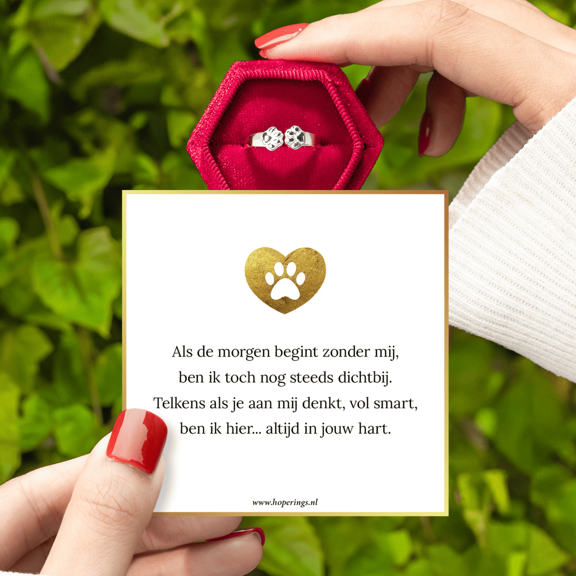 "Ik ben dol op mijn poot-knuffelring, ik voel me nu dichter bij mijn geliefde Buddy. Hij was mijn 16-jarige golden retriever en betekende alles voor mij. Ik heb het gevoel dat hij altijd bij me is Ik heb zojuist nog een ring bij jullie gekocht voor mijn zus. Haar hond Cherrie is onlangs aan kanker overleden, ze was 9 jaar." 💔